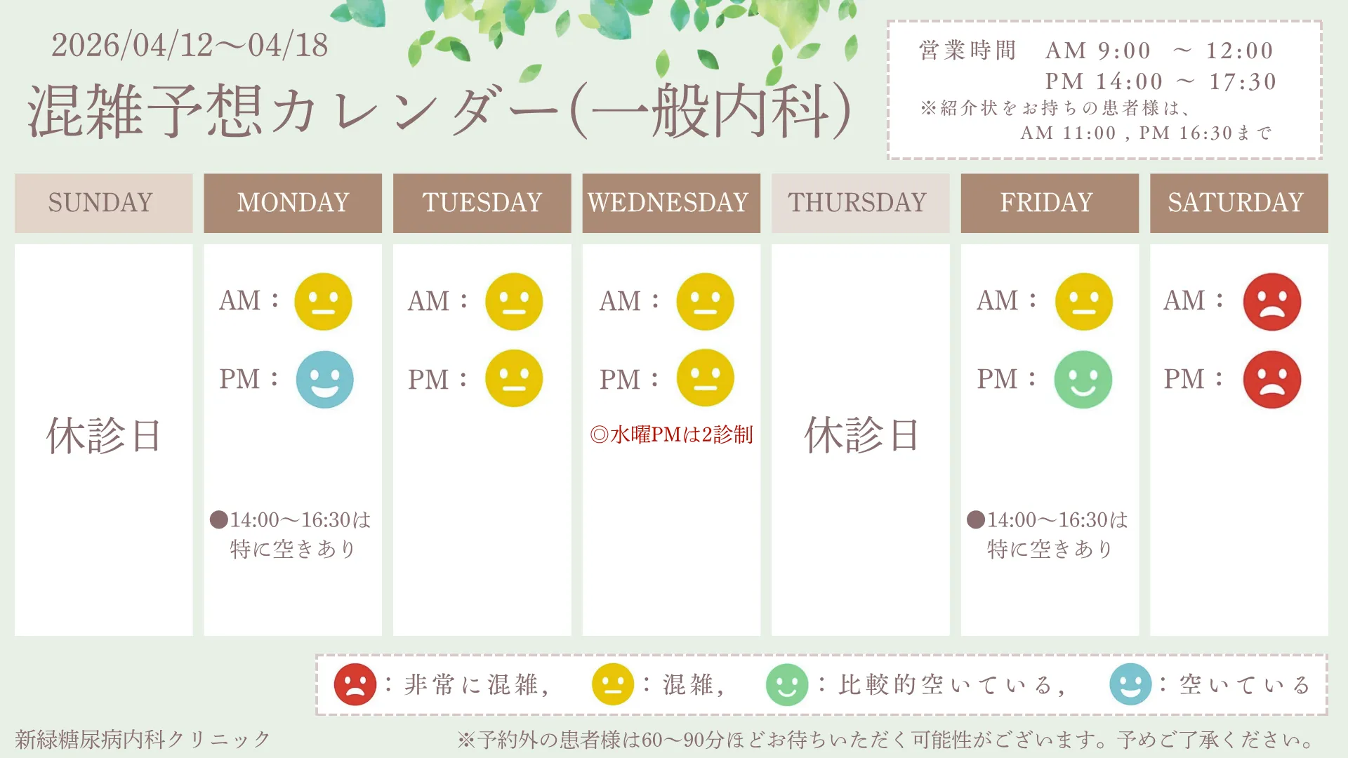 ※年間を通して、土曜日は非常に混雑しております。予約外の患者様は、90~120分ほどお待ちいただく可能性がございます。お急ぎの方は、他の曜日をご検討ください。