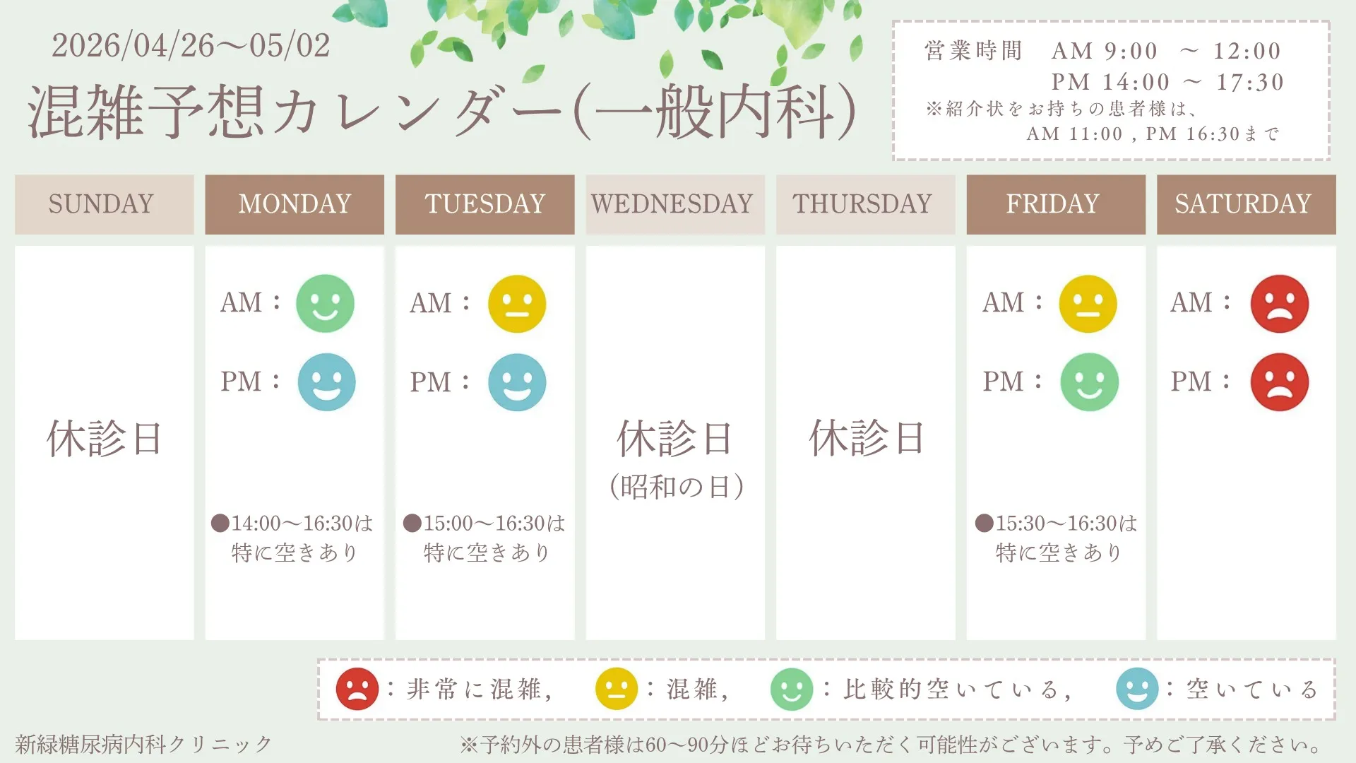 #混雑予想カレンダー #内科 #クリニック #川口市 #樹モールプラザ #糖尿病 #高血圧 #脂質異常 #甲状腺 #アレルギー