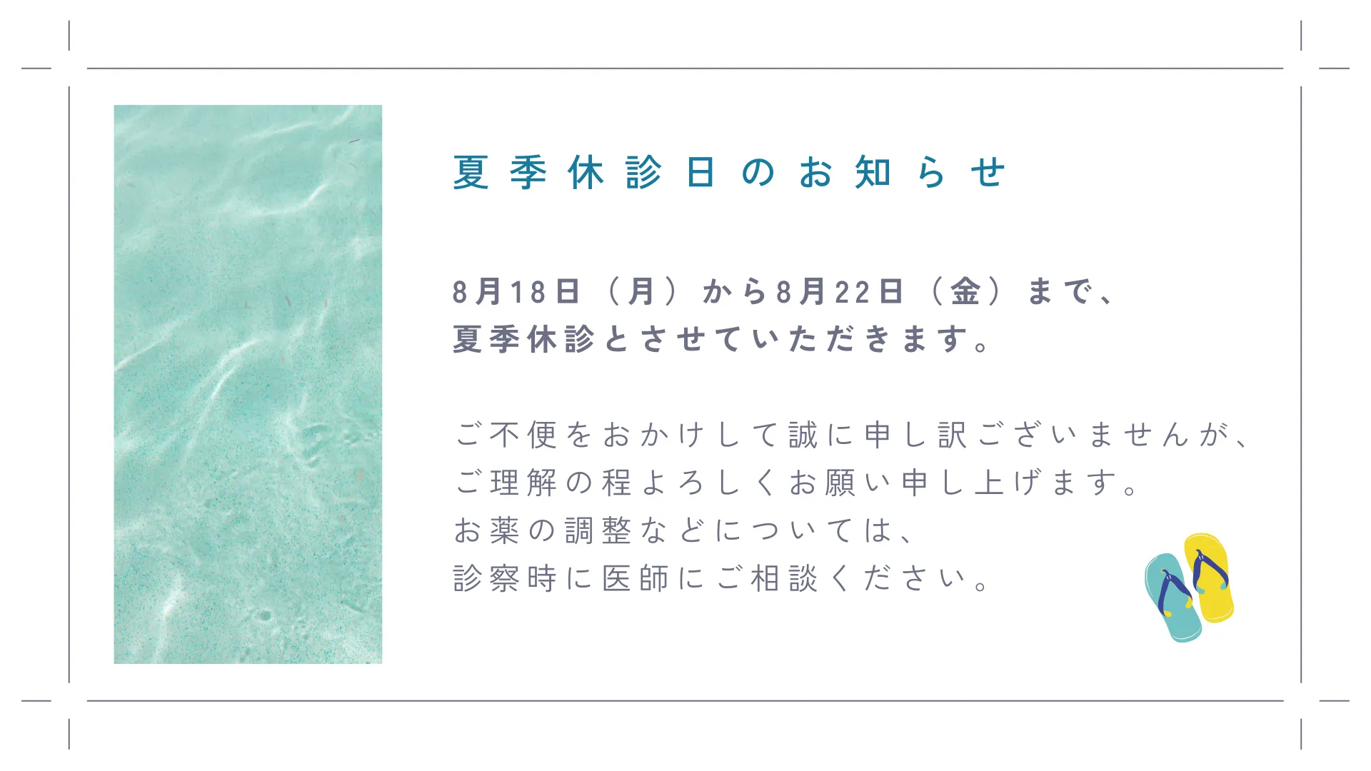 8月18日(月)から8月22日(金)まで夏季休診とさせていただきます。また、8月11日(月)は祝日ですが通常診察を行います。ご不便をおかけして誠に申し訳ございませんが、ご理解の程よろしくお願い申し上…
