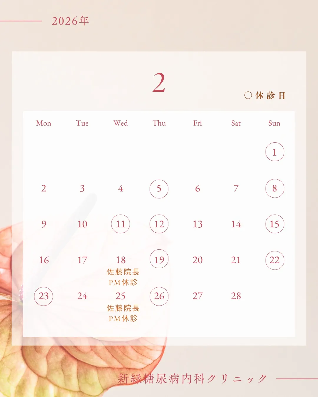こんにちは🍓新緑糖尿病内科クリニックです。2月の診療カレンダーです。今月もどうぞよろしくお願いいたします。#内科#クリニック#川口市#樹モールプラザ#糖尿病#高血圧#脂質異常#甲状腺#アレルギー糖尿病…
