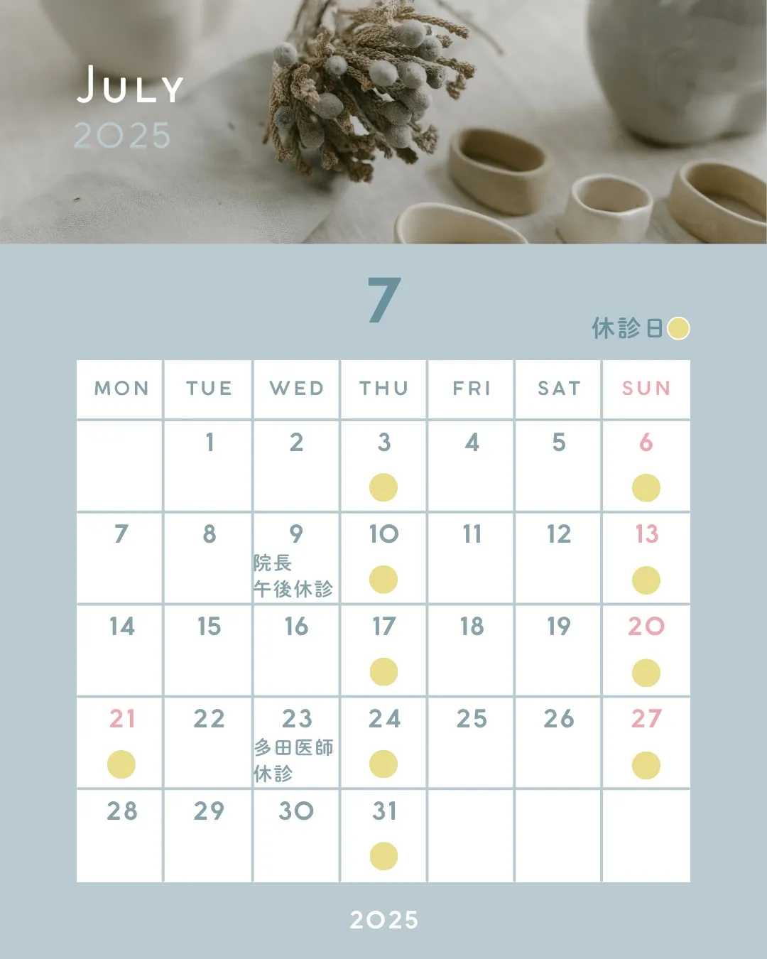 7月の診療についてお知らせします🌻 7月の診療についてお知らせします🌻7月9日(水)午後は、佐藤院長が休診となります。7月23日(水)は、多田医師が休診となります。よろしくお願いいたします。#川口#内科#クリニック#樹モールプラザ#糖尿…