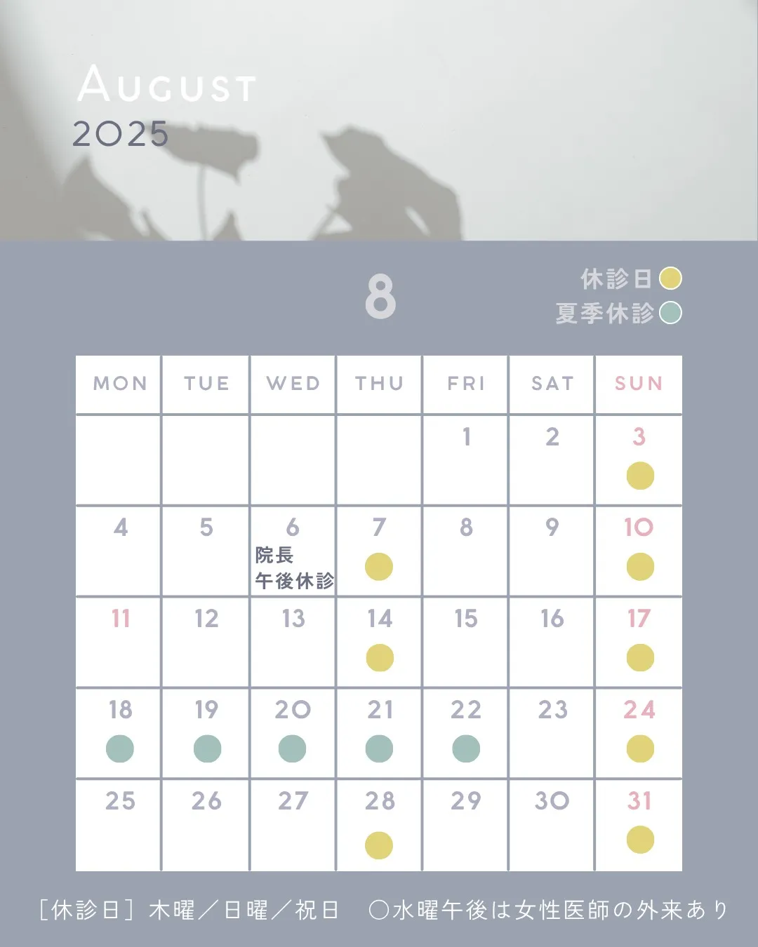8月の診療についてお知らせします🌊 8月の診療についてお知らせします🌊8月6日(水)午後は、佐藤院長の外来は休診です。8月18日(月)から22日(金)まで、夏季休診をいただきます。よろしくお願いいたします。#川口#内科#クリニック#樹モー…