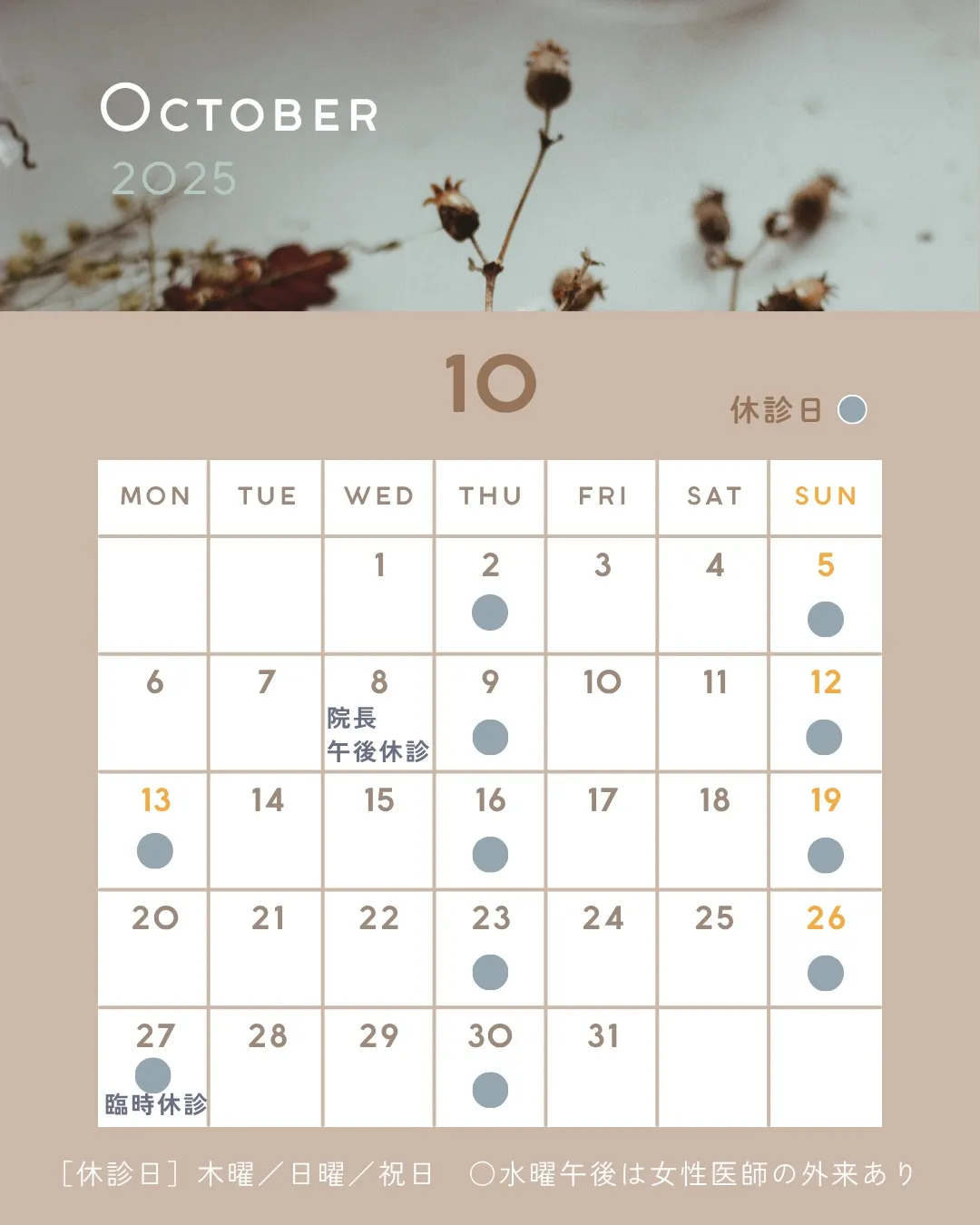 10月の診療についてお知らせします🌰 10月の診療についてお知らせします🌰10月8日(水)午後は、佐藤院長の外来は休診です。10月26日(日)休日当番医のため、翌日27日(月)は終日休診とさせていただきます。今月もよろしくお願いいたします…