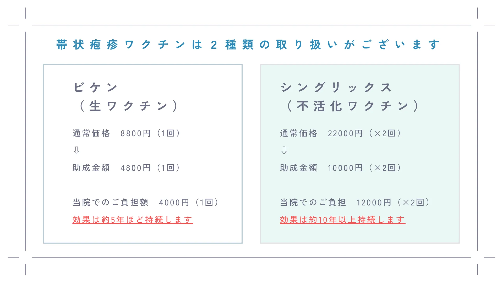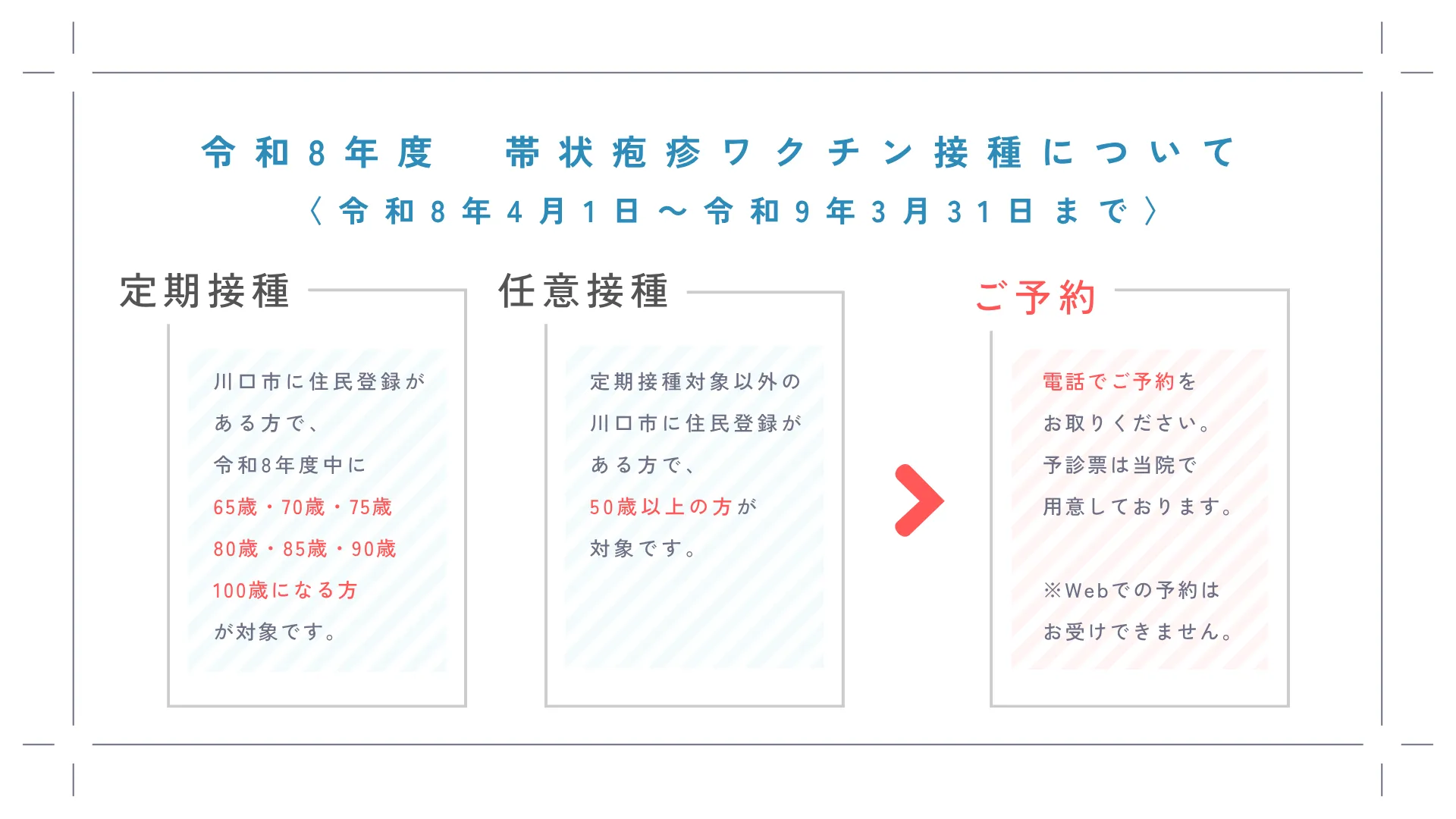令和8年度帯状疱疹ワクチン接種について 2026/04/01 令和8年度帯状疱疹ワクチン接種について、お知らせいたします。 ご予約はお電話にて受け付けています。 オンライン予約ではお受けできませんので、ご注意ください。 川口市在住の方は補助金が活用できます。 対象条件がございますので、下記画像をご覧ください。
